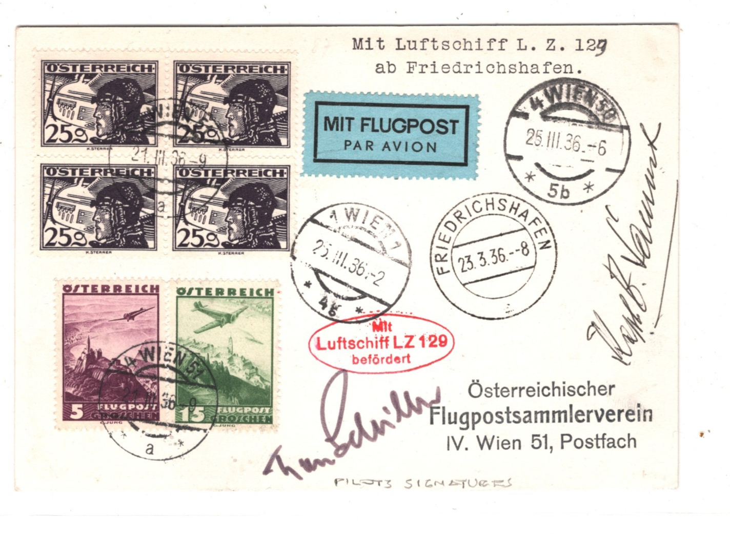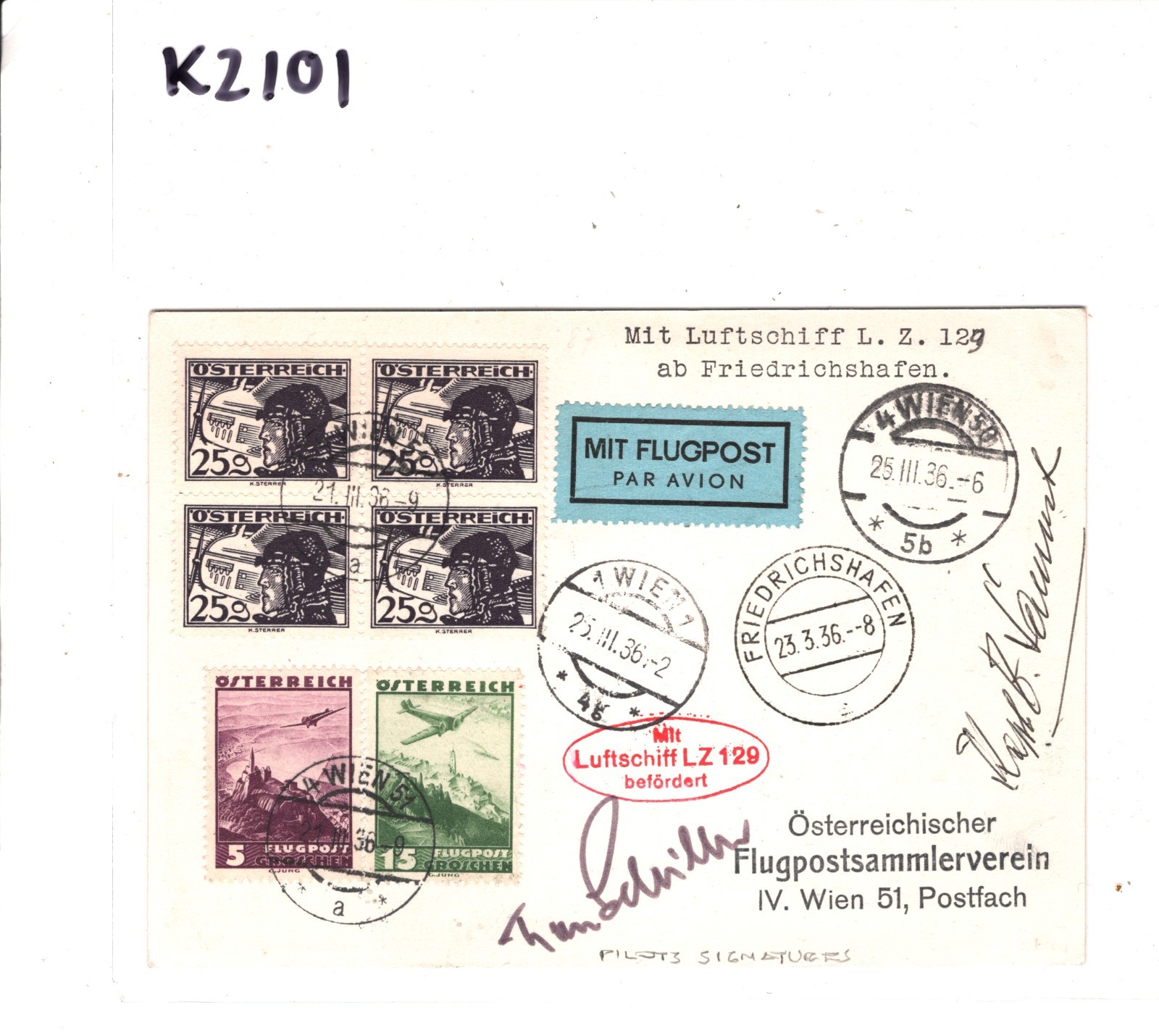 HINDENBURG ZEPPELIN Card AUSTRIA Acceptance/Treaty Air Mail 1936 *SIGNED TWO PILOTS*? Vienna KZ101
