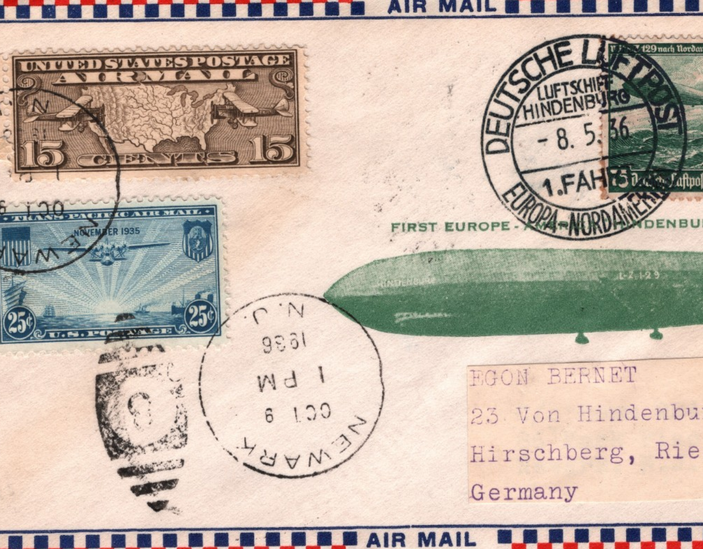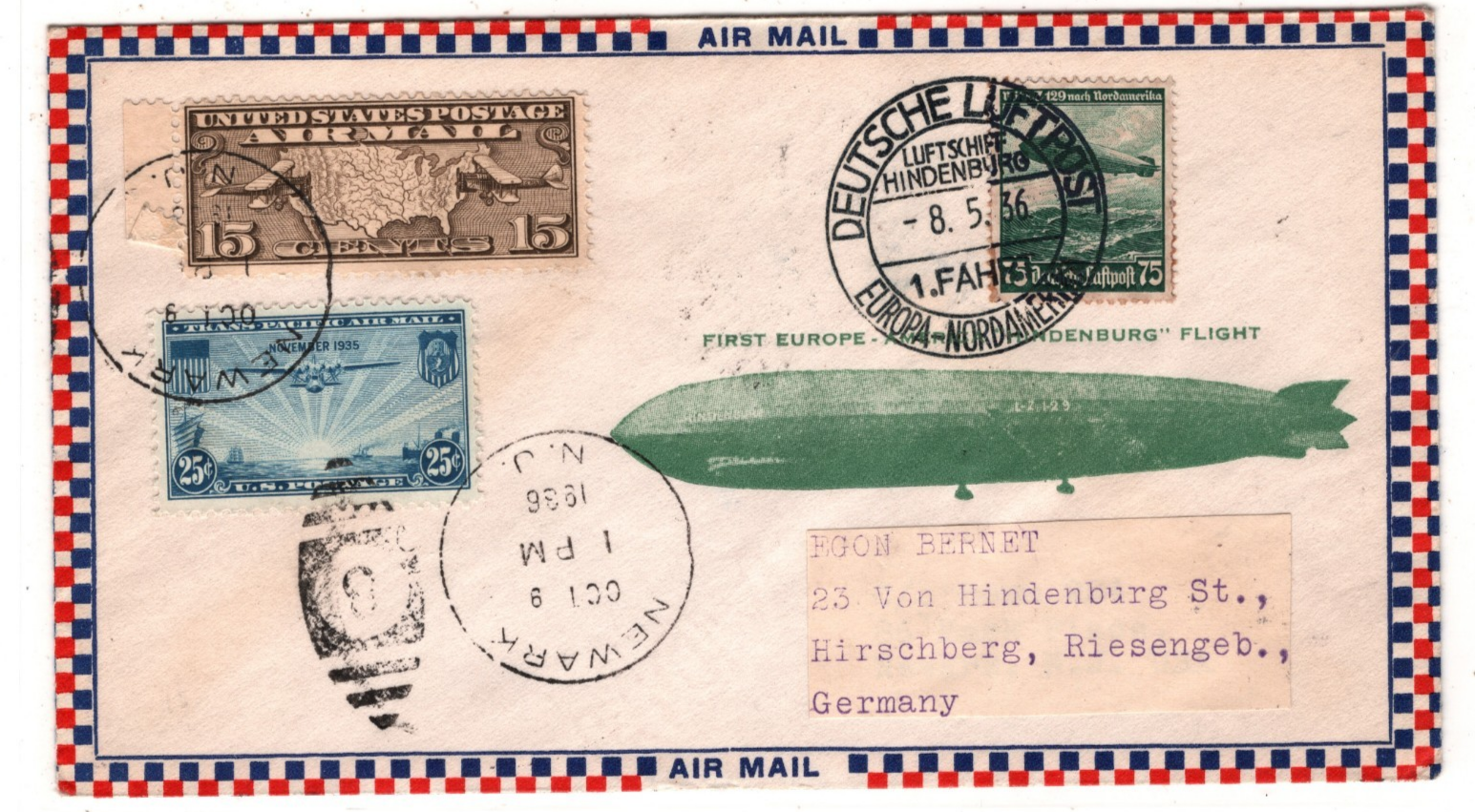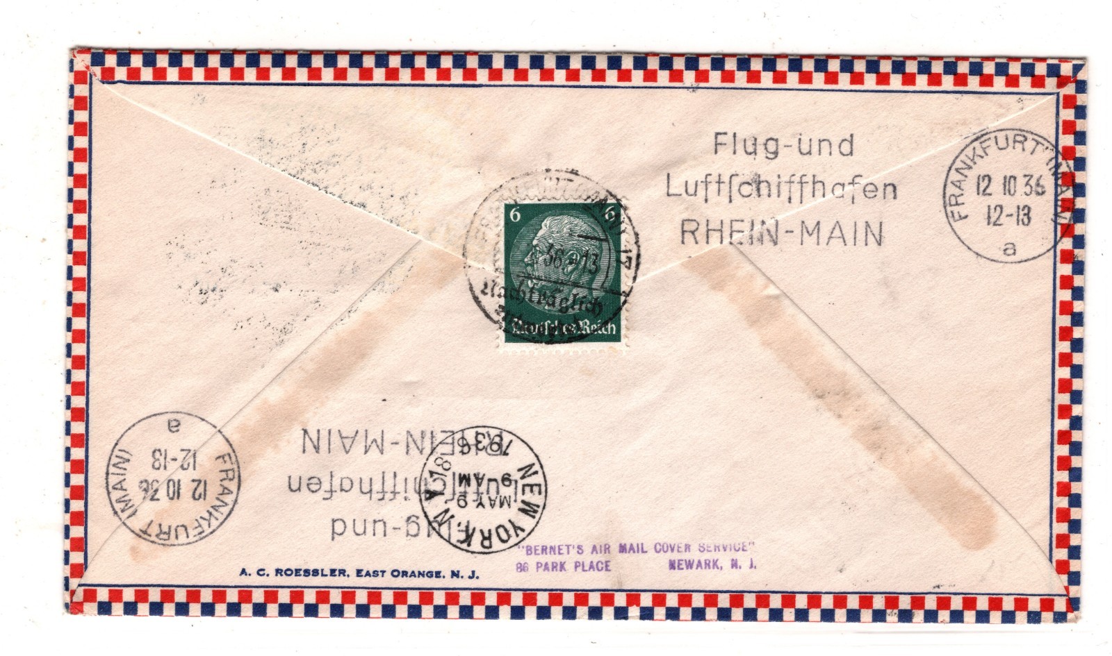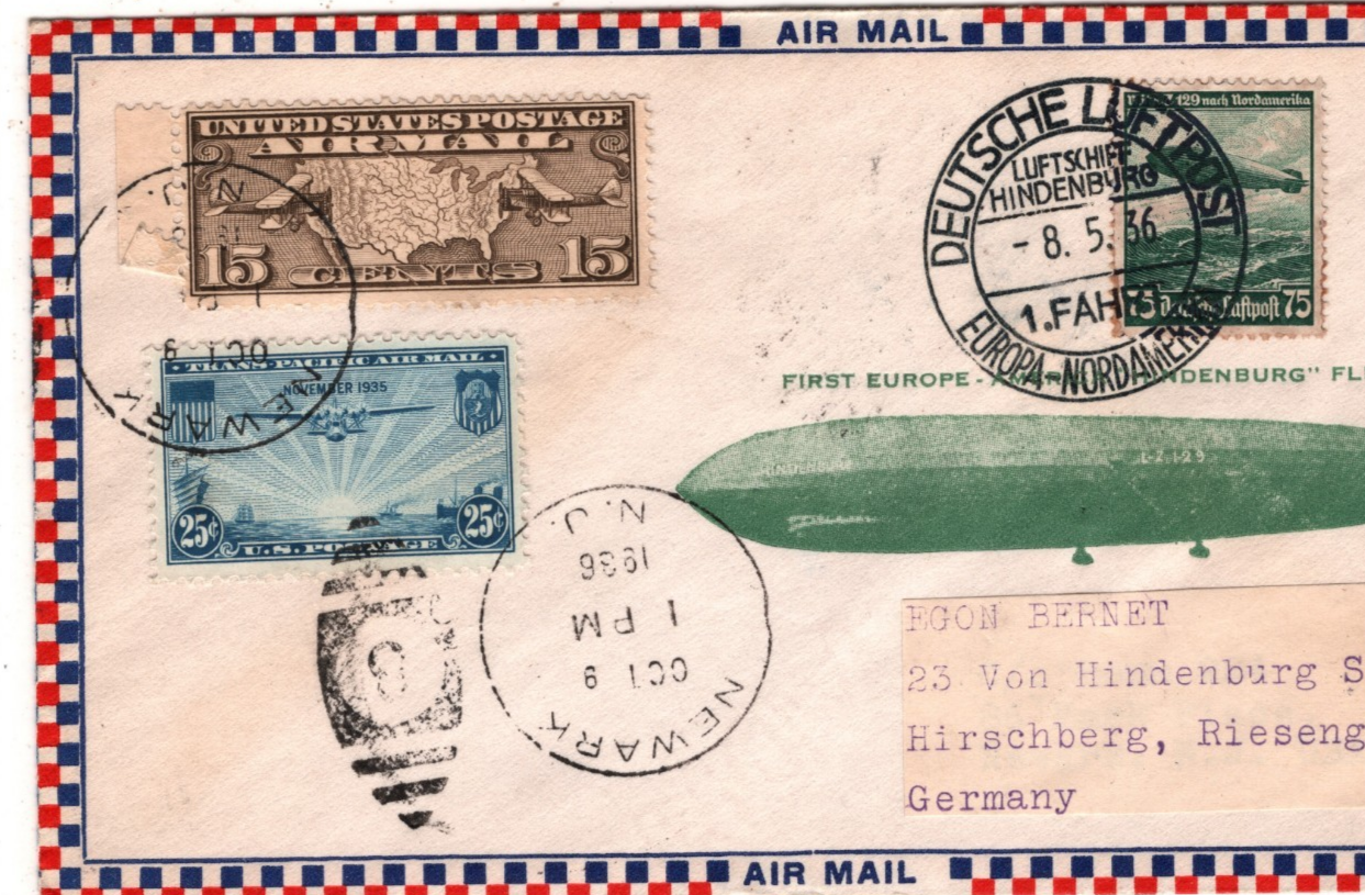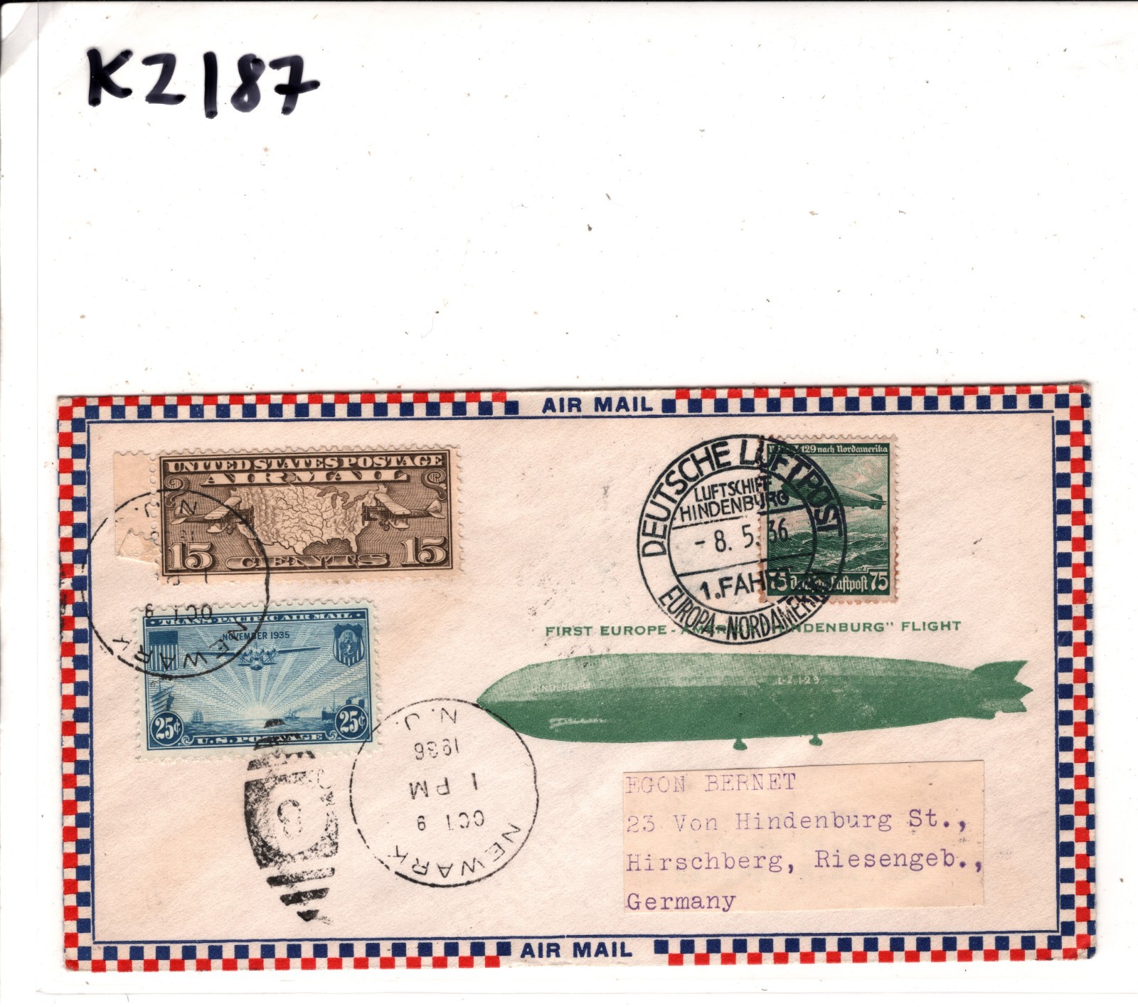 ZEPPELIN HINDENBURG 1936 USA FIRST FLIGHT Cover Airmail Hirschberg (now Jelenia Góra Poland) Newark NJ Mixed Franking Germany KZ187