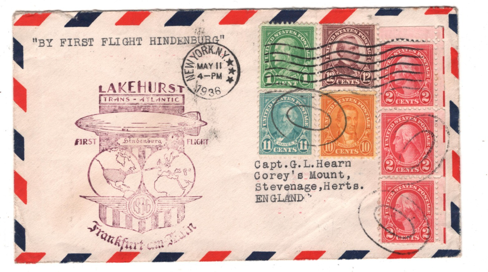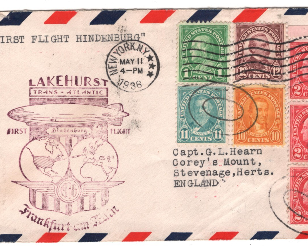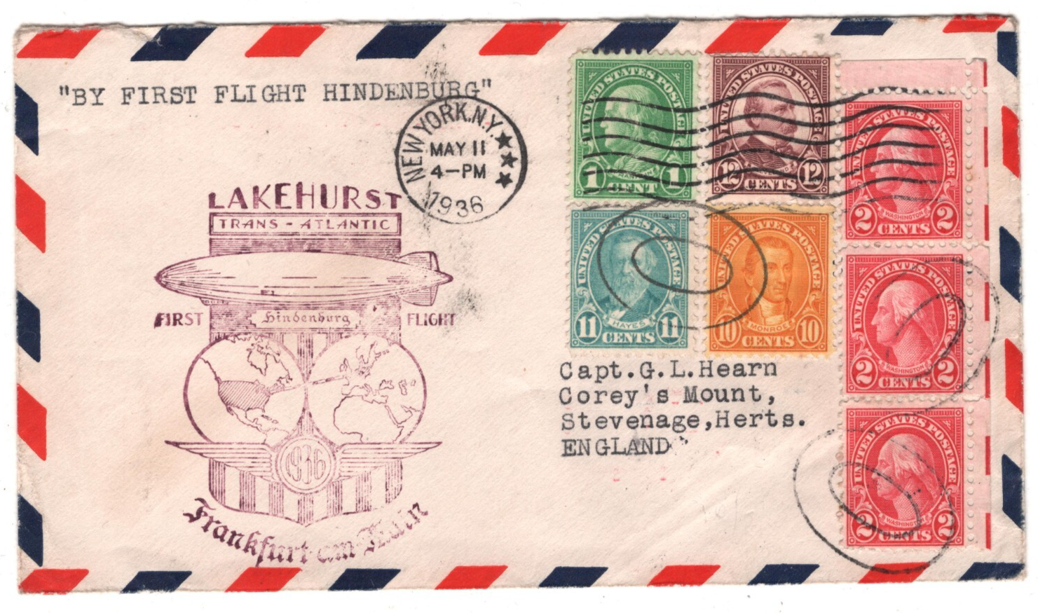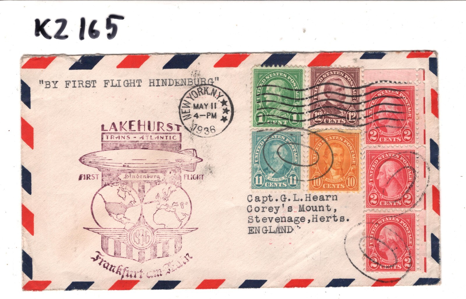USA HINDENBURG ZEPPELIN Air Mail Cover 1936 FIRST FLIGHT New York GB Herts Hatfield KZ165