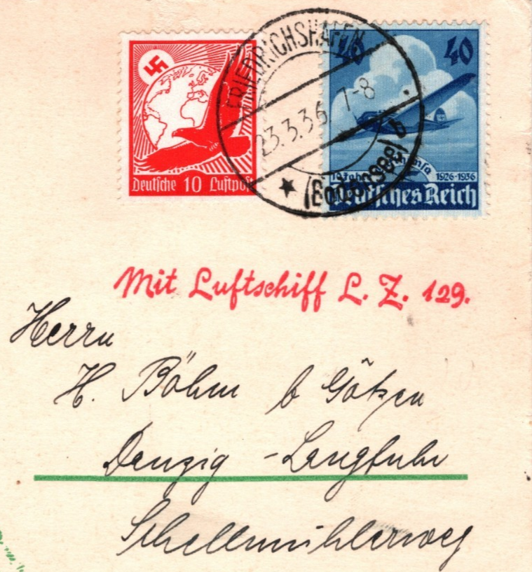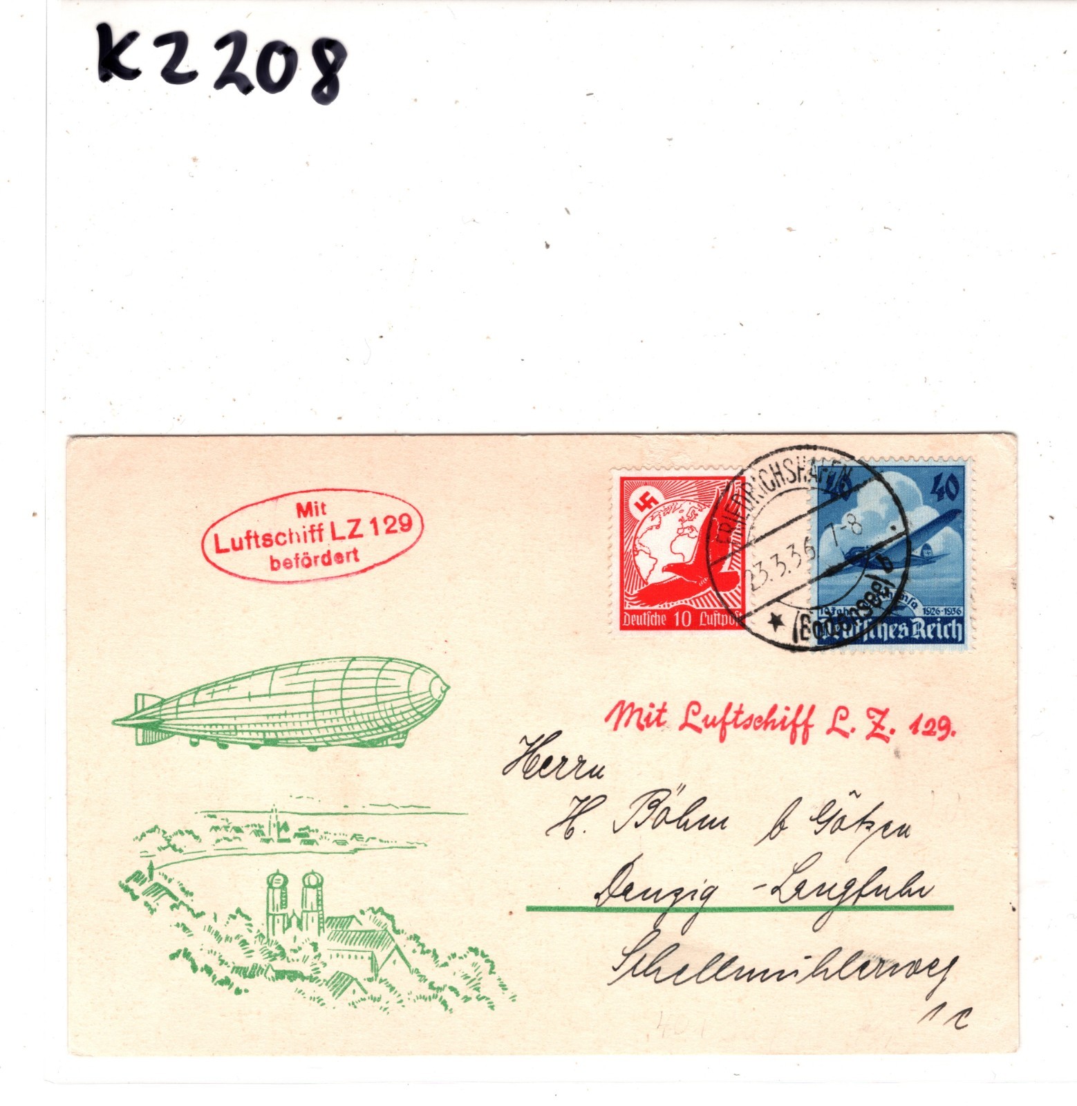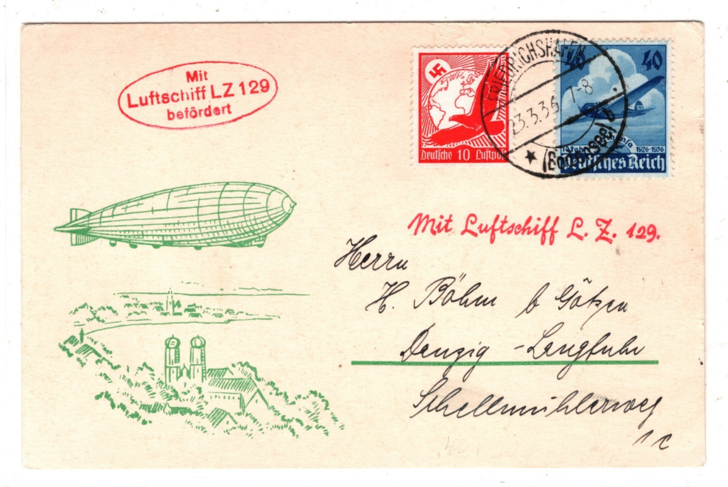 ZEPPELIN HINDENBURG 1936 Card Air Mail DANZIG Friedrichshafen Germany KZ208