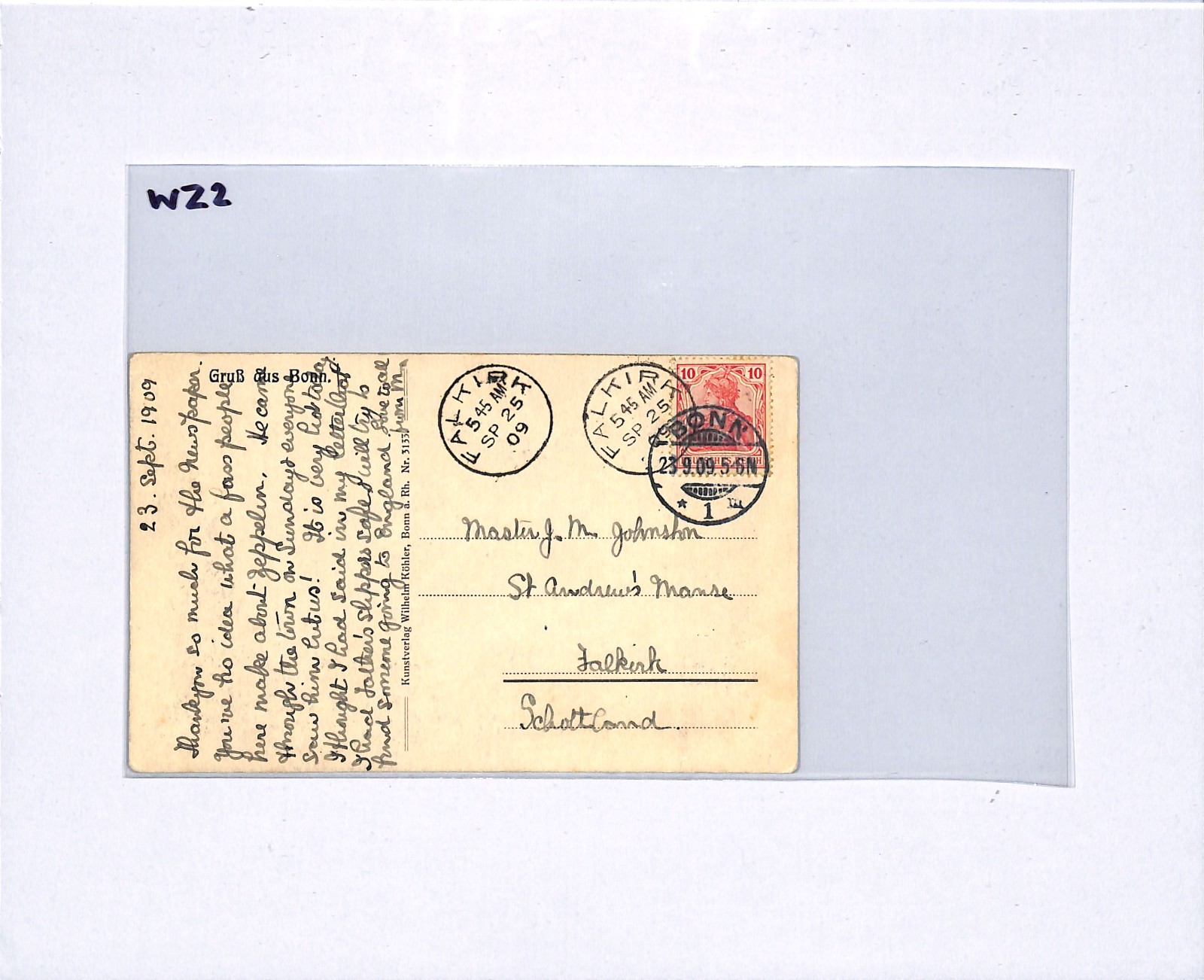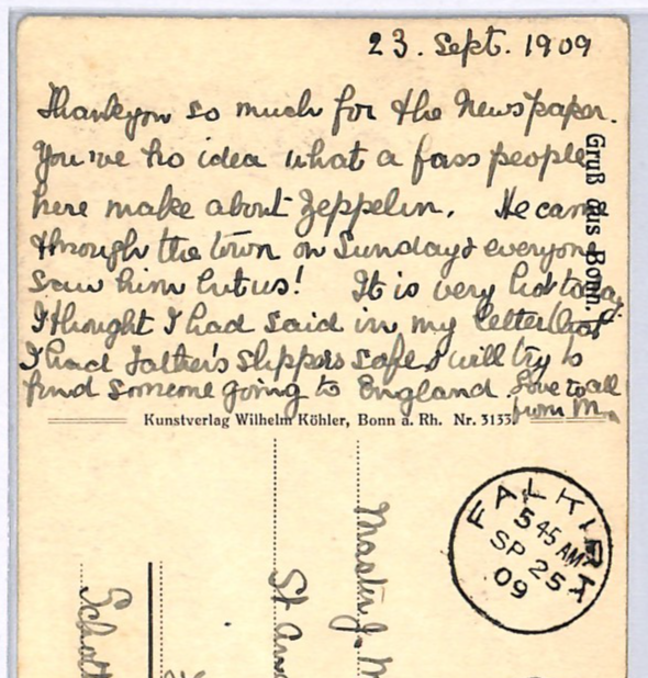 ZEPPELIN Postcard Bonn 1909 CDS *WHAT A FUSS!* Falkirk ENGLISH MESSAGE WZ2