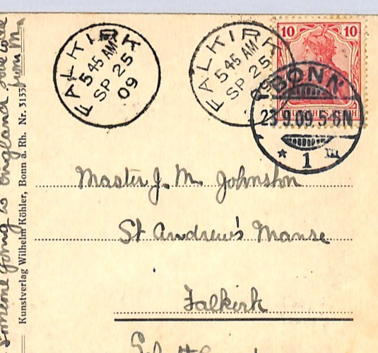 GERMANY ZEPPELIN Postcard Bonn GB Scotland Falkirk 1909{samwells-covers}WZ2