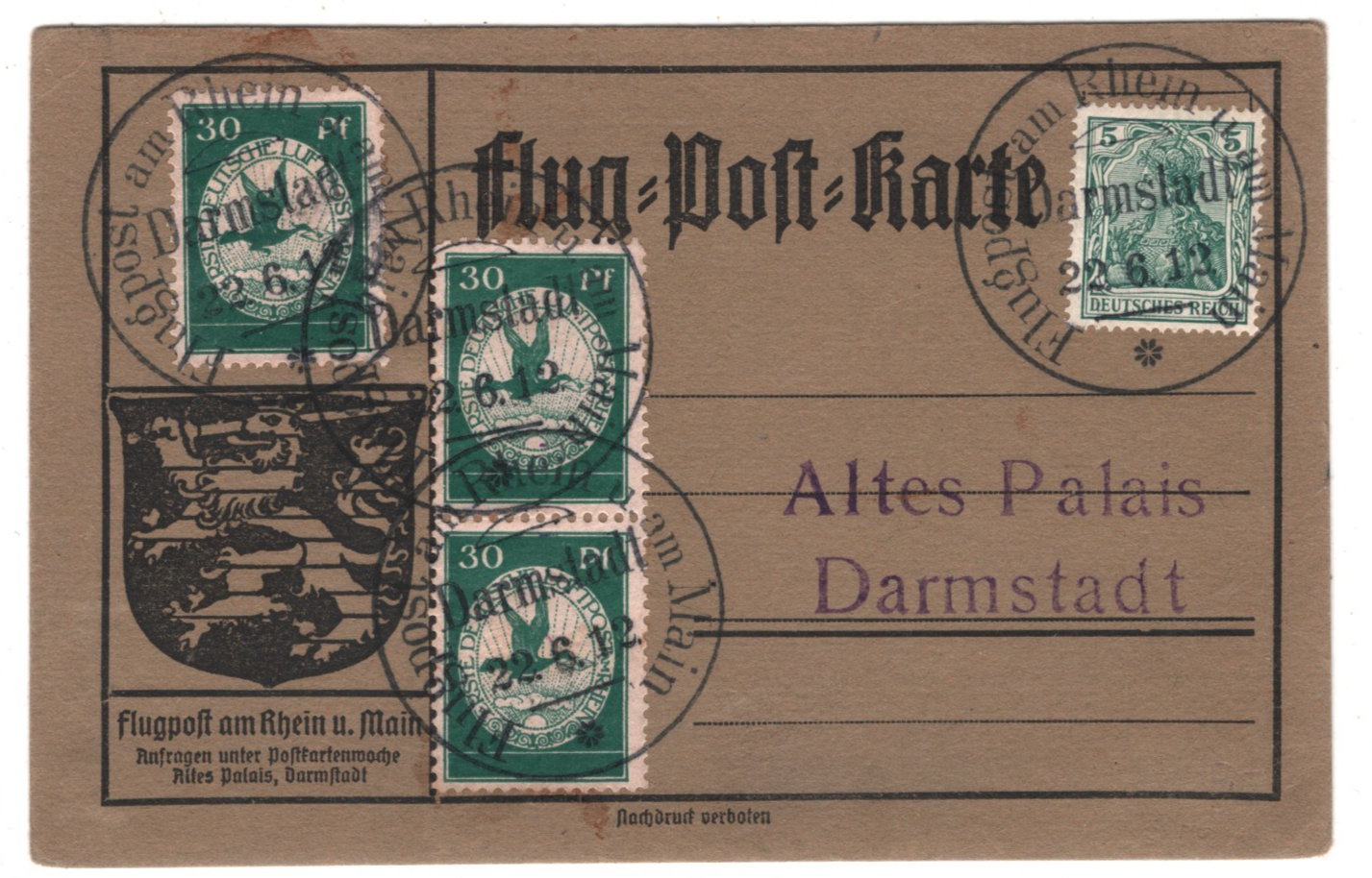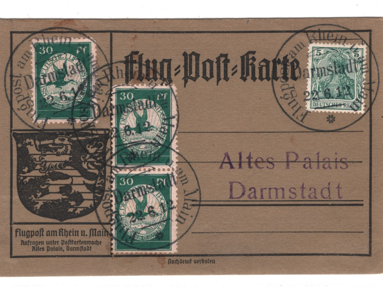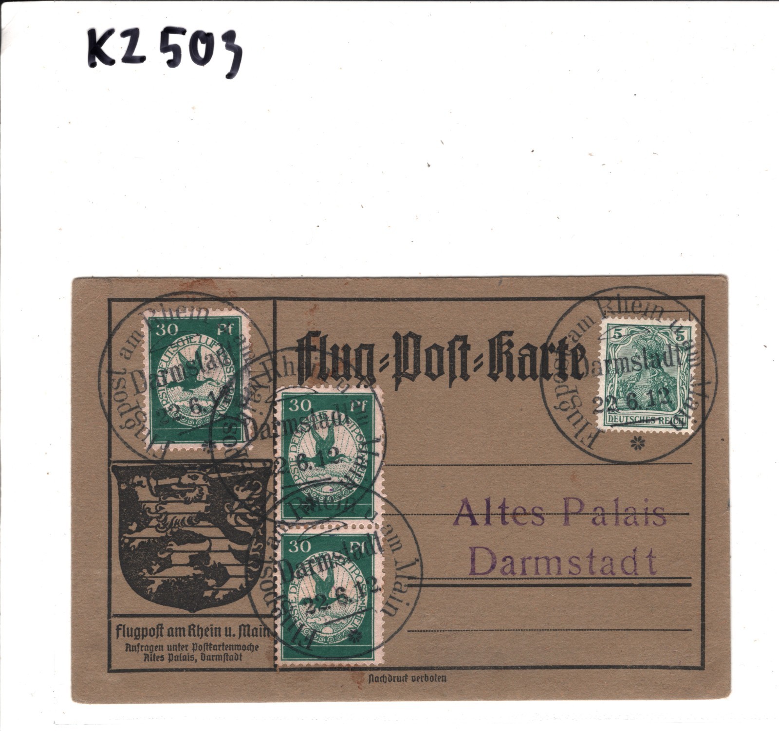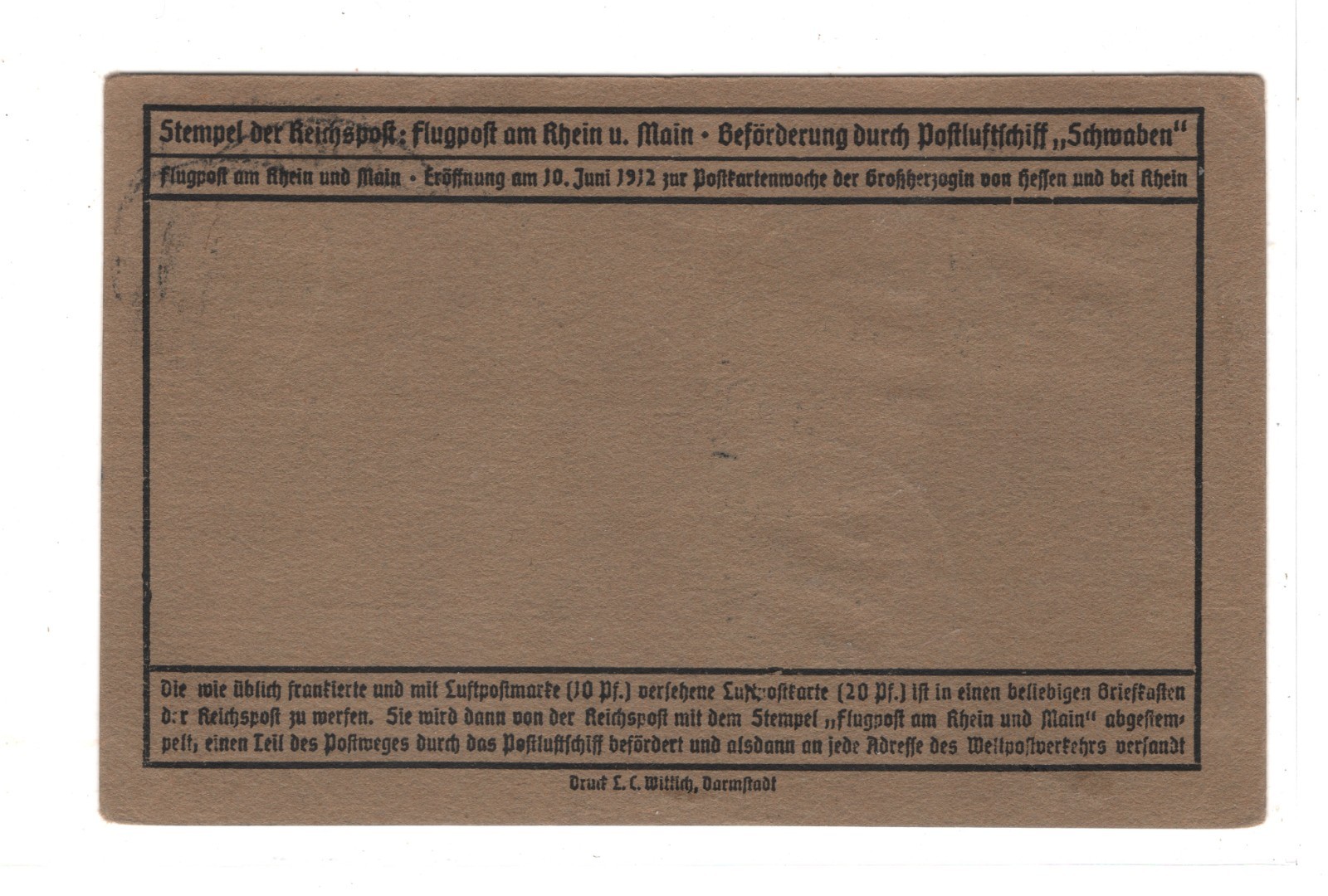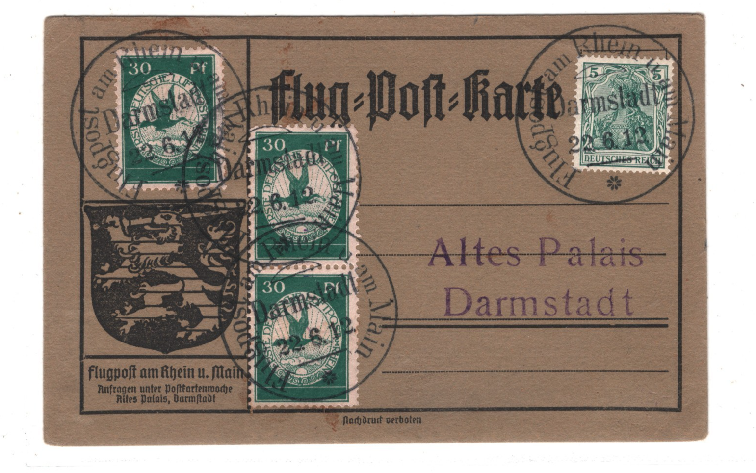 ZEPPELIN SCHWABEN Pioneer Air 1912 Card 30pf BIRDS Stamp{3} 23/6 Flight KZ503