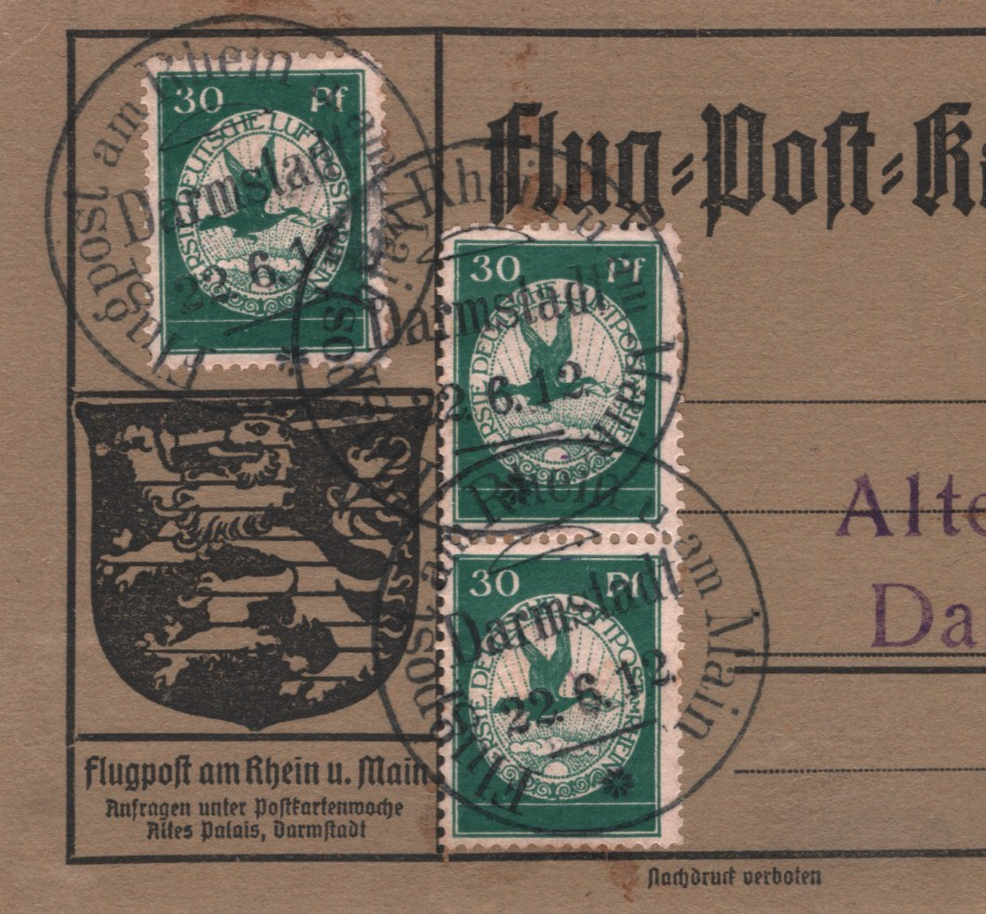 VERY SCARCE early PIONEER ZEPPELIN FLIGHT air mail flown within the RHEIN-MAIN scheme. HIGH RATE FRANKING featuring THREE scarce 30pf CARRIER PIGEON/BIRDS issue Semi-Official stamps. Extremely Fine for an item of this type & period. Please look at all the scans to help form your own opinion (WAF).