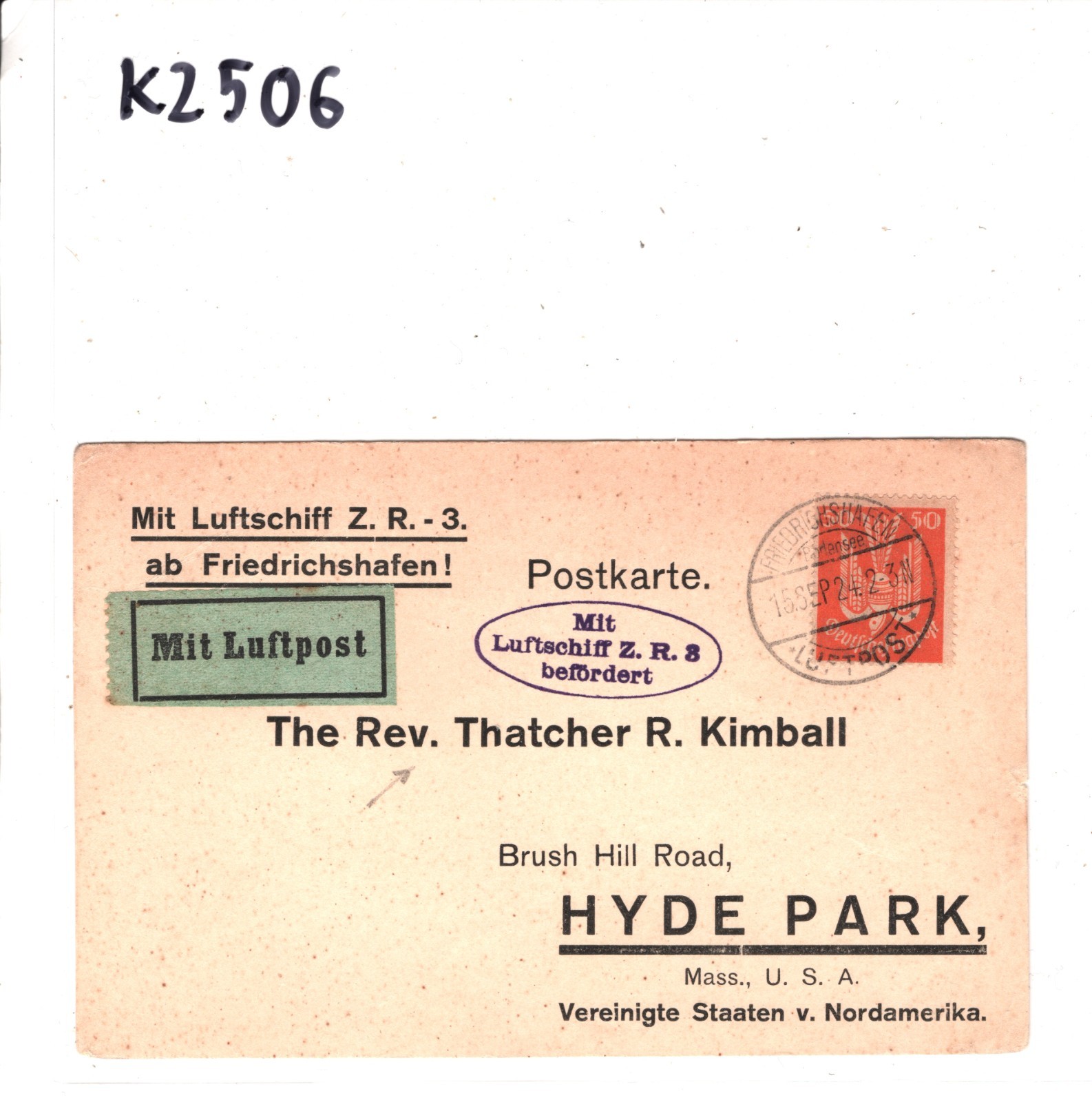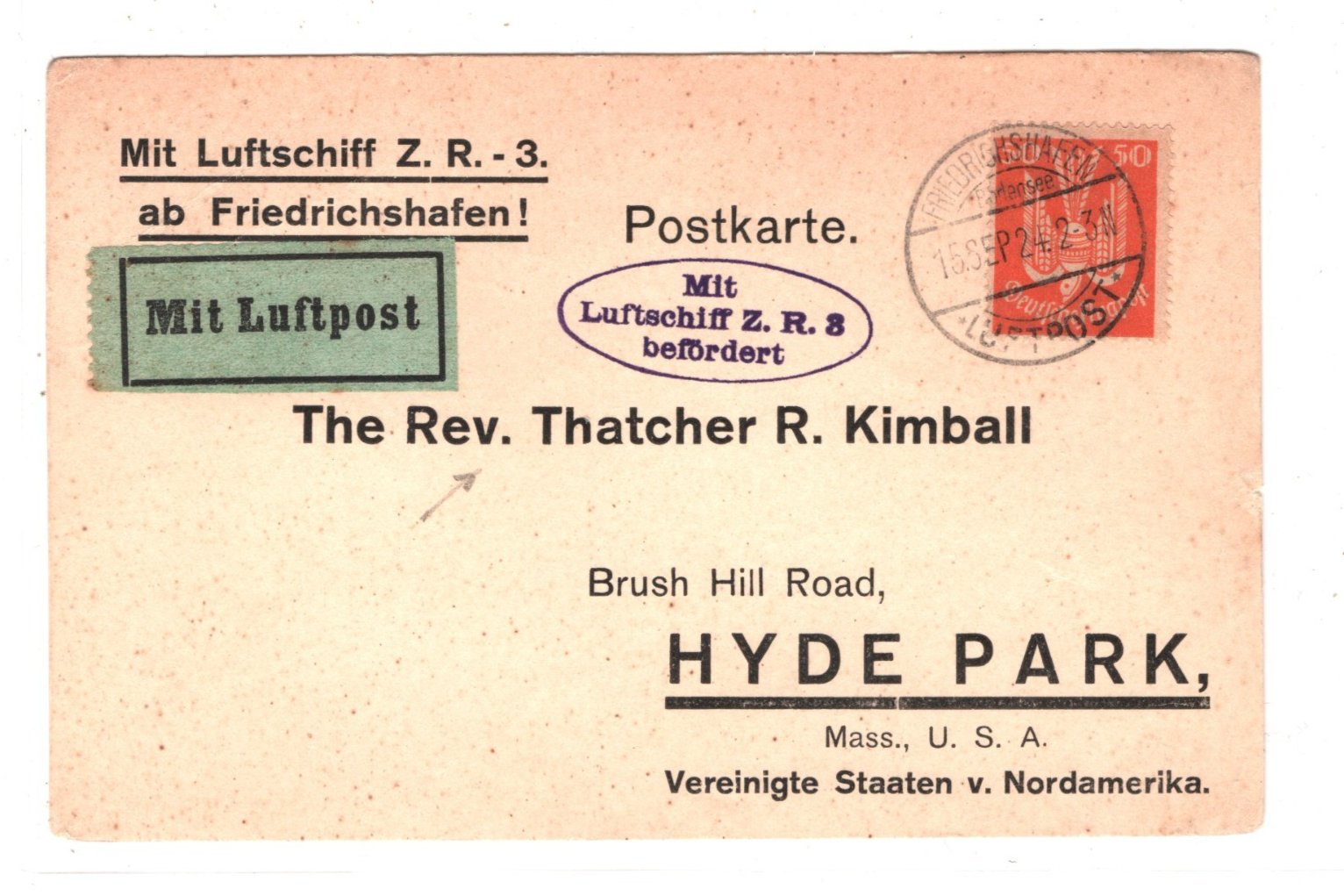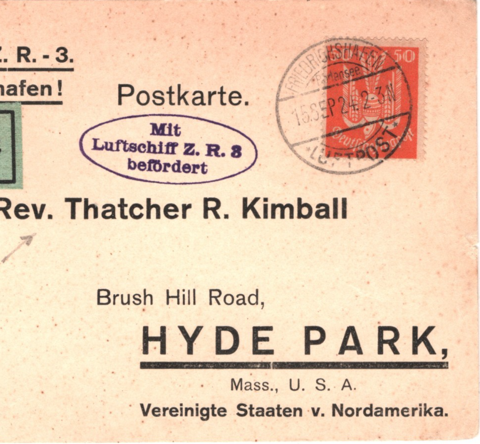 ZEPPELIN *ZR-3* LZ.126 Air Mail Card 1924 TRANSATLANTIC (USS LOS ANGELES)KZ506GERMANY USA Hyde Park