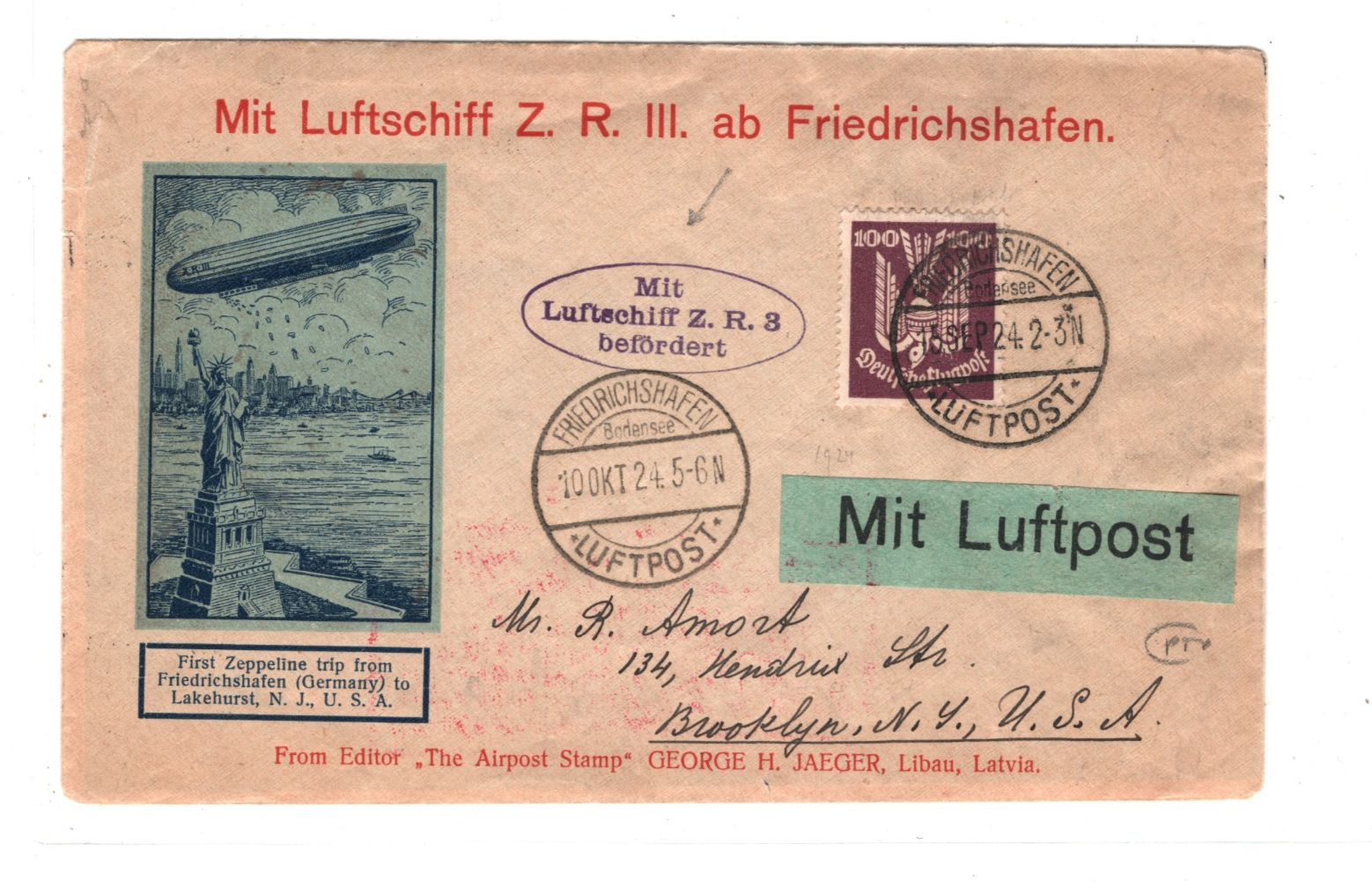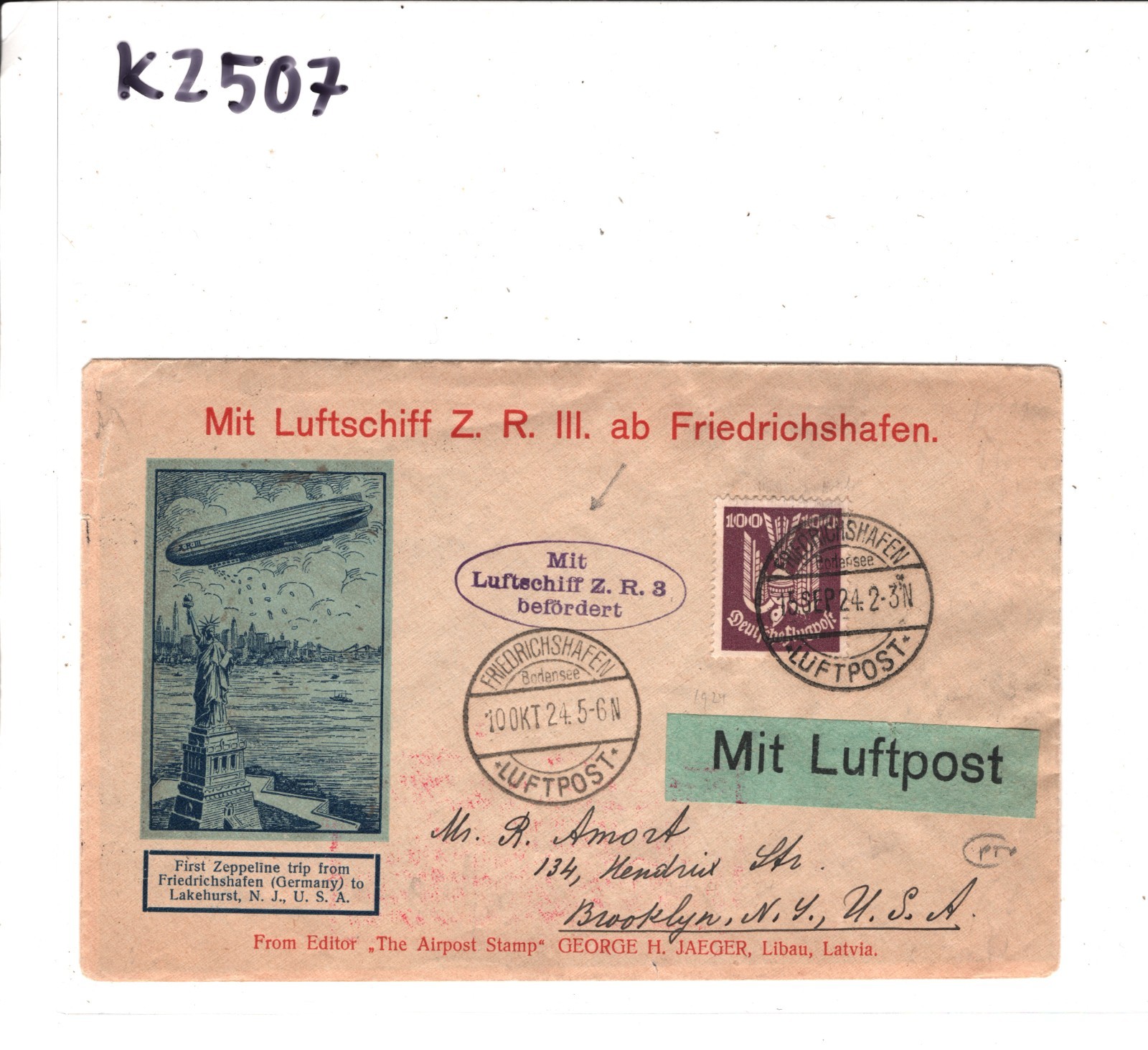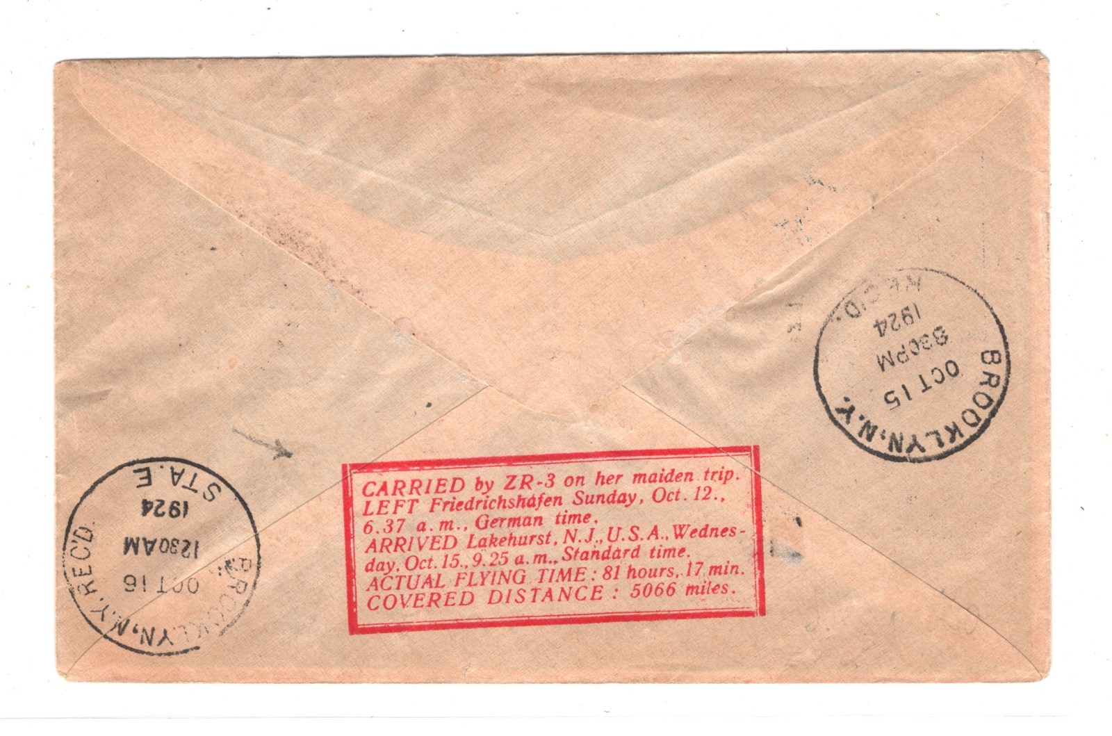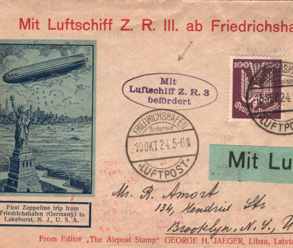 ZEPPELIN *ZR-3* LZ.126 Air Mail Cover 1924 TRANSATLANTIC FIRST FLIGHT (USS LOS ANGELES)KZ507GERMANY USA Brooklyn