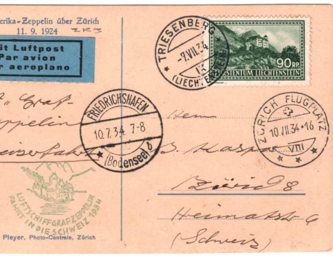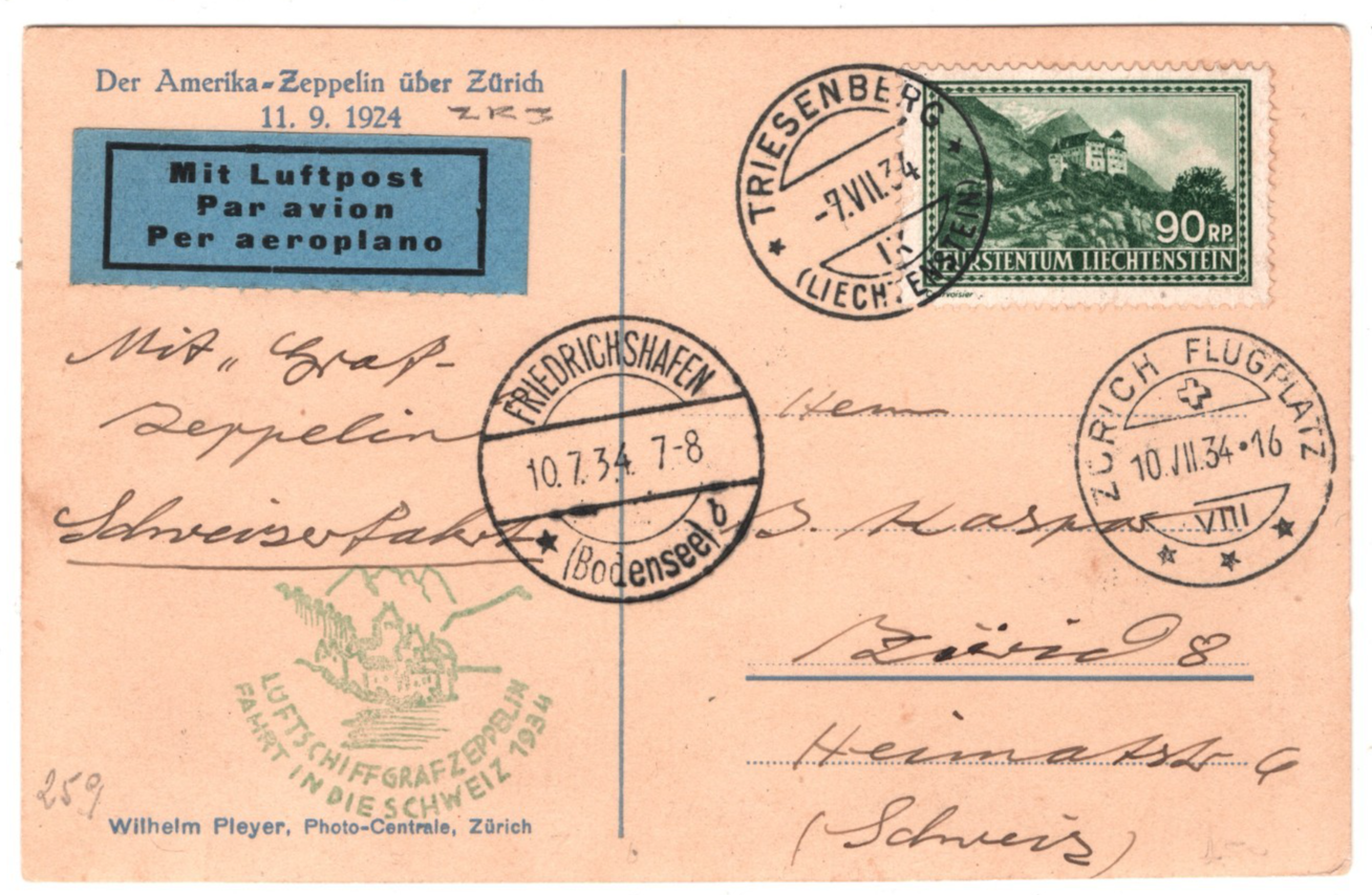 ZEPPELIN ZRIII Postcard (1924) Used LIECHTENSTEIN Graf Zeppelin Air Mail *FAHRT SCHWEIZ* 1934 Zurich KZ482