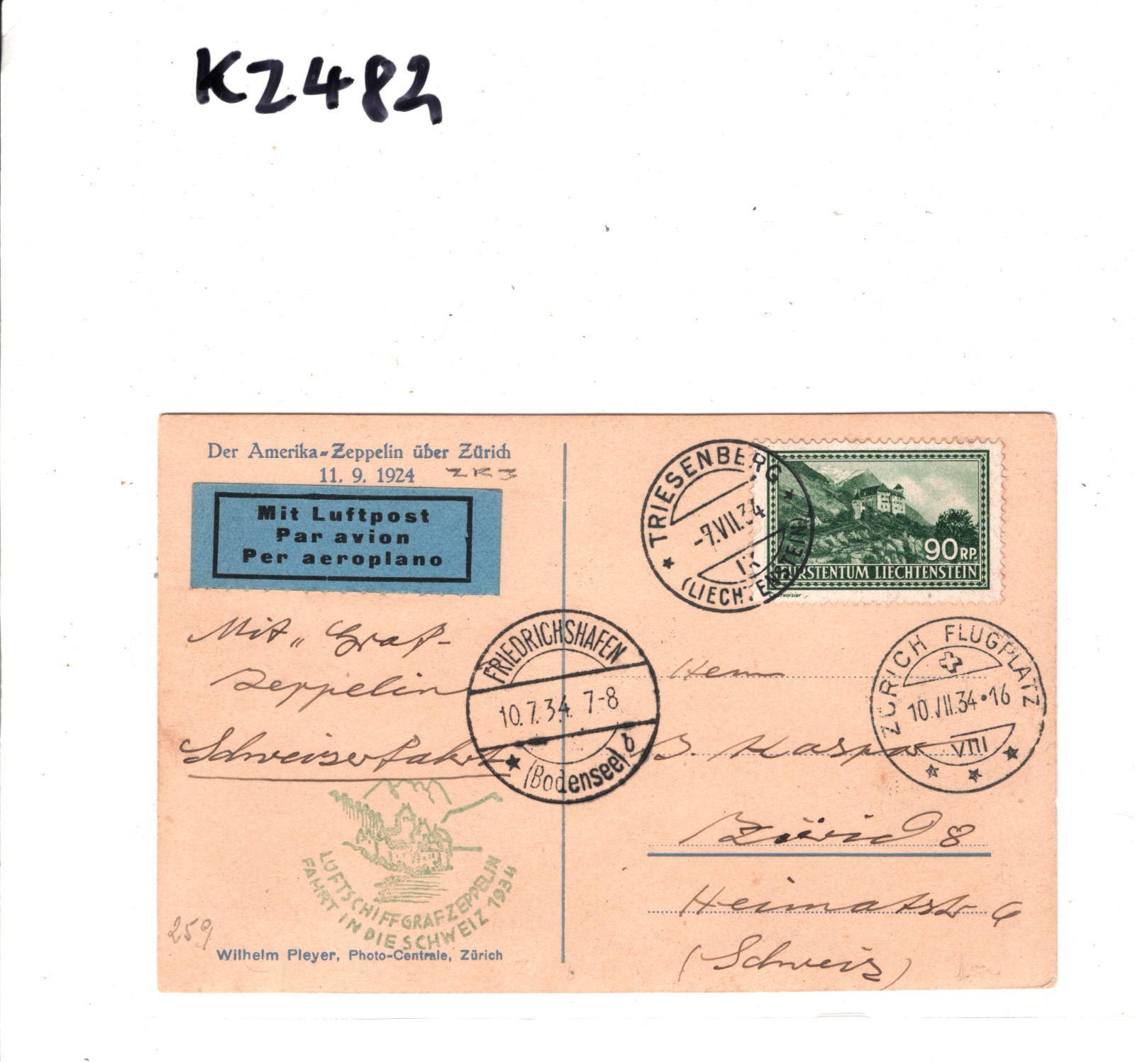 ZEPPELIN ZRIII Card (1924) LIECHTENSTEIN Air *FAHRT SCHWEIZ* 1934 Zurich KZ482